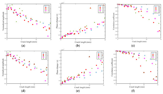 Damage features of specimens: (a) normalized amplitude of 300~700 kHz L-Chip; (b) phase change of 300~700 kHz L-Chip; (c) correlation coefficient of 300~700 kHz L-Chip; (d) normalized amplitude of 500 kHz GCC; (e) phase change of 500 kHz GCC; and (f) correlation coefficient of 500 kHz GCC.