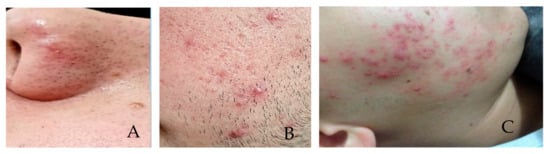 Grade I, comedones, without inflammatory lesions (Figure 1A); Grade II, comedones, papules, and pustules with varying intensity and few to numerous inflammatory lesions with some erythema (Figure 1B); Grade III, comedones, papules, and pustules with an intense inflammatory reaction that leads to the formation of nodules, which may contain pus (cysts) (Figure 1C); Grade IV, comedones, papules, pustules and fistulas, larger cysts forming large lesions [14].