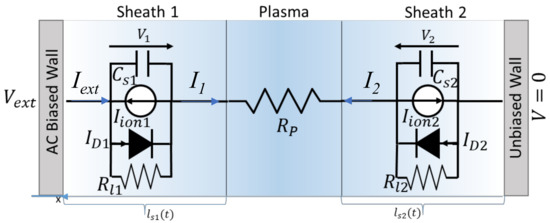 The equivalent circuit of each of the two electrode/plasma interfaces is found by exploiting the relationship between the transport current flowing across an electrode with area A, at a voltage V in contact with a plasma at the potential , with V < Vp, that can be written as follows: