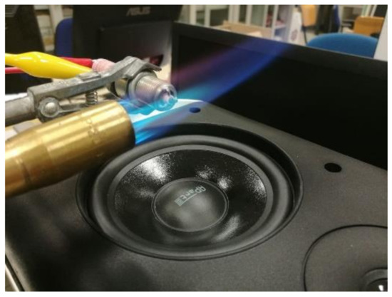 During the lab tests, the pressure pulsations in the combustion chamber were emulated by generating pressure waves using a loudspeaker mounted near the flame. The chosen loudspeaker box has an acoustic suspension design, and we can consider the loudspeaker acting as a piston in a frequency interval from zero to an upper value determined by the cone dimension. [28]. The adopted loudspeaker has a diameter of , and can act as a piston in the frequency range . As shown in Figure 6, the loudspeaker cone was placed under the flame at a distance of about to avoid overheating.