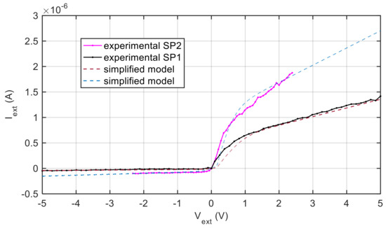 Considering the most relevant features of the I-V sensor characteristics, in this paper we propose a simplified model exploiting two ‘true diodes’ which are described by the right term of Equation (3) both for Vj > 0 and for Vj < 0, i.e., exploiting only the relationship in the first row of Table 1 (neglecting the effect of switched role between ions and electrons in case of Vj < 0), adapting the constant current generator value, and using a constant resistance with the value defined in Equation (2), i.e., assuming a linear relationship between the external voltage and ion current magnitude. This circuit can be easily used to simulate the behavior of ion sensors exploiting electrical circuit simulators as, for instance, Spice.