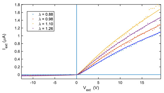 I-V characteristics obtained with the turbine spark plug and the laboratory test burner for different air to fuel equivalent ratios λ, as per legend. Dots: experimental data; solid lines: model fitting.