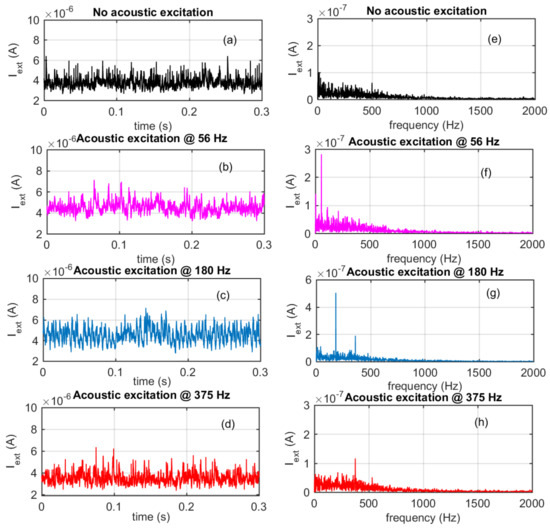 Signals from the spark plug front end circuit in the absence and in the presence of acoustic excitation as a function of time (a–d), and FFT of the acquired signals (e–h).