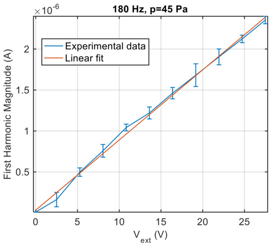 Dynamic measurements were performed in the laboratory exploiting the measurement set up described in the previous section (Figure 6) and the gas turbine spark plug. It must be highlighted that, considering the estimated parasitic components for this spark plug and the front-end circuit parameters values, the expected bandwidth of the measurement system is about 10 kHz. The measurements were performed using single tones with frequency in the interval and acoustic pressure amplitudes in the range . The pressure pulsation amplitudes used in these tests are similar or smaller than those present in a real combustor chamber. However, differently from the laboratory test conditions, in the combustion chamber there is an average pressure larger than the atmospheric pressure, given by the compressor and the gas turbine operating conditions, which in absence of pulsations is almost constant.