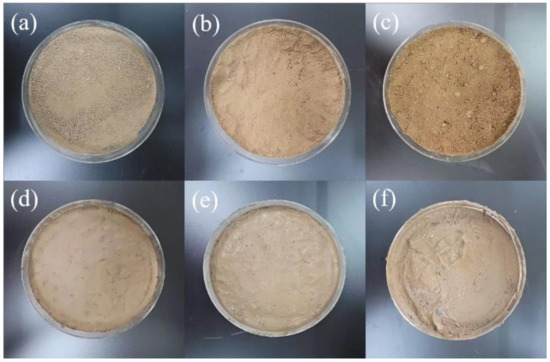 Images of soils with different SMCs (0% (a), 8% (b), 16% (c), 24% (d), 32% (e) and 40% (f)), prepared by mixing the dried soil (in an oven at a temperature of 105 °C for 24 h) with deionized water in different weights.