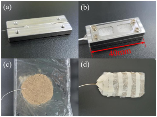Installation of the experimental set-up. (a) The POFBG positioned in the V-groove; (b) sensor probe: the POFBG in the stainless-steel package with polypropylene mat as a filter; (c) the sensor probe embedded in soils; (d) sensor probe wrapped up by polyethylene films.