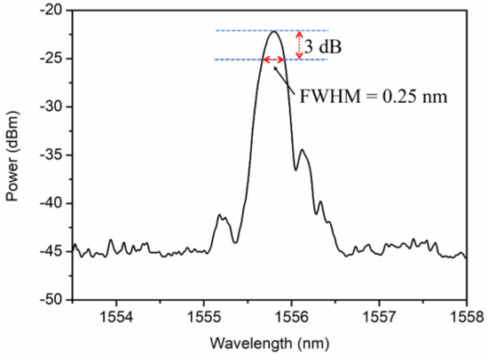 Reflected spectrum of the POFBG after annealing at 60 °C and 90% RH for 48 h. The full width at half maximum is 0.25 nm.