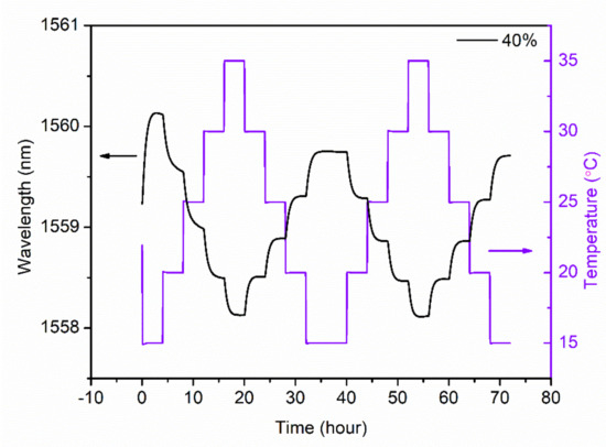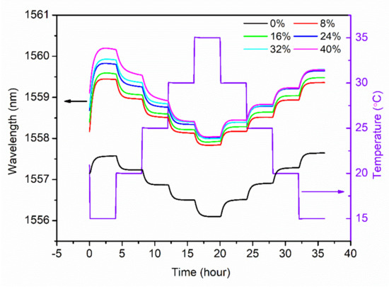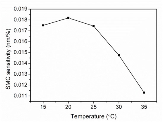 It is worth mentioning that as shown in Figure 6 when the temperature varies from 15 °C to 35 °C, the wavelength varies about 2 nm, and thus, the variation would completely mask the wavelength change due to the SMC change in condition that the sensor probe is applied in the field without temperature control. Though temperature cross sensitivity is problematic for the SMC measurement, the influence could be eliminated by integrating another humidity-insensitive temperature sensor, such as a silica FBG temperature sensor, as a reference.