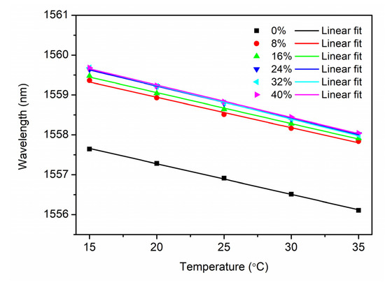 For different SMCs from 0% to 40%, temperature characterization of the sensor probe was implemented for one cycle between 15 °C and 35 °C with a step of 5 °C and a duration of 4 h. Figure 4 shows the evolution of the Bragg wavelength with respect to the temperature changes in 36 h. For the SMC at 0%, the Bragg wavelength during the whole process is much lower than those for SMCs from 8% to 40%, which may be caused by very high extraction of water in the extremely dry conditions. It is also found that as the temperature increases, the Bragg wavelengths are not completely stabilized within 4 h, especially for SMC 24%, 32% and 40%, which may be attributed to the longer moisture equilibrium time among the soil, the air in the cavity of the package and the POF. However, as the temperature decreases, it appears that the Bragg wavelengths are stabilized sooner, as shown in Figure 4. Thus, compared to the increase process, the temperature measurement in the decrease process is more reliable. The corresponding response time defined as 90% of the total Bragg wavelength shift is achieved, which is ~1 h. After linear regression in the temperature decrease process, the relationship between the Bragg wavelength and the temperature is illustrated in Figure 5, showing sensitivities of −0.077 nm/°C, −0.076 nm/°C, −0.078 nm/°C, −0.081 nm/°C, −0.084 nm/°C and −0.081 nm/°C for SMC 0%, 8%, 16%, 24%, 32% and 40%, respectively. These sensitivities are very similar, and the average value is −0.080 ± 0.003 nm/°C.