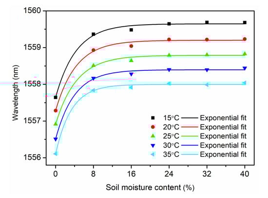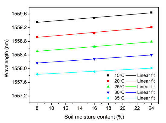 Based on the data from the temperature decrease process of the first cycle (see Figure 4), the relationship between the Bragg wavelength and the SMC at a constant temperature, which is 15 °C, 20 °C, 25 °C, 30 °C and 35 °C, respectively, is demonstrated in Figure 7. Using exponential fitting, a non-linear relationship is displayed. It is found that the sensitivity is decreasing at higher SMCs, and it becomes even insensitive for the SMC over 24%, which is similar to the report by Leone et al. [14]. Though the greatest variation was obtained in the range from 0 to 8% showing highest SMC sensitivities, this range is far from the threshold definition of the dry soil in agriculture, which is 10~15% depending on the soil composition. However, the sensor operating range from 8% to 24% is helpful for a warning of a dry soil, which needs to be further investigated. Additionally, the sensor seems to be practically insensitive for a SMC range between 16% and 24% by the exponential fitting, which is worse than the result obtained in [14]. Fortunately, for gravimetric SMC between 8% and 24% (or 8.7% and 26.1% in volumetric SMC), a linear relationship is obtained by a linear regression of raw data from Figure 7 with sensitivities between 0.011 nm/% and 0.018 nm/%, as shown in Figure 8.