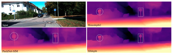 We evaluated our depth prediction by using the metrics described in [44]. As shown in Table 3, we compared our method with other representative works. All the self-supervised approaches can be divided into two categories according to whether the input at the time of testing is a single frame or multiple frames. In general, the methods where the input is a single frame at test time are more widely used, although there is a performance gap between them and multi-frame methods. The results in Table 3 show that our method outperforms all existing approaches and further closes the gap between single-frame methods and multi-frame methods. We observe that our SHdepth with ResNet-50 has the best performance. Furthermore, our SHdepth can beat all the methods except HR-Depth when we use ResNet-18 as the backbone. Despite the fact that Packnet-SFM has better values for evaluation measures Sq Rel and RMSE, the number of its parameters is 128.29 M, which is far more than our SHdepth (R18) with 15.66 M parameters.
