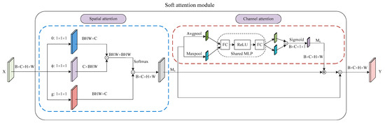 Illustration of soft attention module. We show the arrangement of the spatial and channel attention and more details of these two submodules.