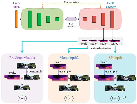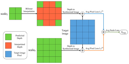 Many existing efforts have demonstrated that using multi-scale depth prediction can effectively prevent training from falling into local optima. The previous models [14,21] here are a simple combination of prediction results at different scales in the depth decoder, as shown in Figure 4. Before image reconstruction at each scale, the resolution of the RGB image needs to be reduced to the same as the output depth map of each decoder layer. However, this method always creates ‘holes’ in the low-texture regions of the intermediate depth maps that have a low resolution due to the uncertainty of photometric error. In order to overcome the issue of holes, the Monodepth2 model upsamples the lower-resolution depth maps to the original RGB image resolution and finally computes the photometric loss at the input resolution. Inspired by techniques in stereo reconstruction [41], the process here is effective because the depth values in the low-resolution depth map can be responsible for the corresponding ‘patch’ of pixels in the high-resolution RGB image. After computing the per-pixel photometric loss at each scale, Monodepth2 combines the multi-scale photometric losses as: