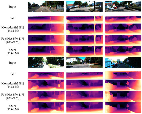 As with most previous papers, we used the KITTI benchmark for training and evaluation. We also adopted the data split of Eigen et al. [44] and removed static frames with Zhou et al.’s [7] pre-processing. Eventually, we used 39,810 monocular triplets for training, 4424 for validation, and 697 for evaluation. For all the images in KITTI, we used the same intrinsics. Specifically, we set the principal point to the image center and the focal length to the average of all the focal lengths in the dataset. Since self-supervised training based on monocular video has no scale information, we have reported the results using the per-image median ground-truth scaling [7].
