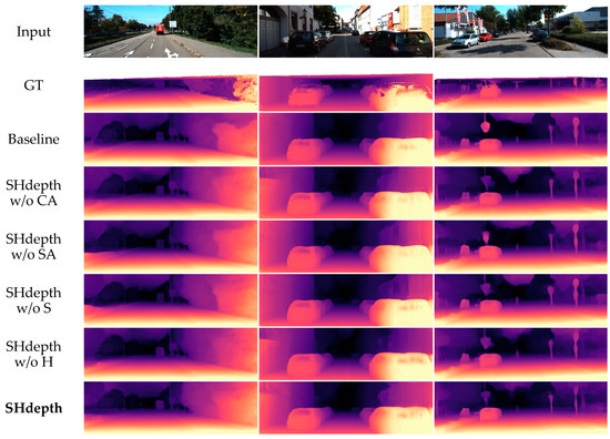 Qualitative ablation study on the KITTI eigentest split. CA (row 4) is channel attention and SA (row 5) is spatial attention. S (row 6) is the soft attention module and H (row 7) is the hard attention strategy in our SHdepth.
