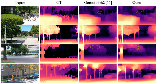 High-accuracy depth estimation plays a very important role in 3D computer vision, especially for applications in robot navigation [1], autonomous driving [2], virtual reality [3], etc. There are various methods of obtaining depth information, such as laser sensors, or binocular or multi-cameras. However, these might be not available in some cases due to high costs or high environmental demands. Actually, monocular images or videos are more common in most scenes. This has led to the rapid development of monocular depth estimation as only one single camera is required. Although it is essentially an ill-posed problem to obtain depth from an RGB image, recent studies have proved that convolutional neural networks (CNNs) can estimate depth by learning the hidden depth clues from the RGB images. The methods based on deep learning mainly include supervised learning and self-supervised learning. Even though supervised learning methods [4,5,6] can achieve excellent estimation results, the requirement for high-precision ground truth data sets limits on the application of these methods. Self-supervised learning methods [7,8,9,10] construct new supervised signals by using depth predictions as intermediate variables through geometric constraints of monocular video or stereo images.