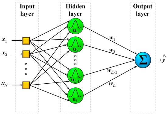 A typical RBF network can be seen in Figure 1. The structure comprises three distinct layers, the first of which is the input layer and has the sole purpose of distributing the N inputs to the L nodes of the hidden layer. The second point differentiating RBFs from other architectures is the existence of only one hidden layer of N-dimensional nodes. In order to produce a prediction given an input datapoint , at first the Euclidean norm is used to calculate the activity for every node by using the difference between the k-th input vector and the l-th node center , such that