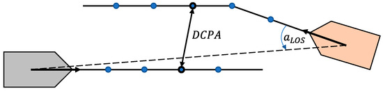 The objective of maritime collision avoidance is the generation of a risk-free trajectory that the controlled vessel should follow. A well-defined and effective method of assessing collision risk in the near future is the closest point of approach (CPA). Stemming from the concept of the CPA, two metrics are defined: time to CPA (TCPA) and distance to CPA (DCPA) (see Figure 2). A discussion regarding the quick calculation of TCPA and DCPA using the line-of-sight (LOS) distance between the controlled vessel and the obstacle ship is presented in [5]. These metrics depict the urgency of the collision danger of vessel i with another vessel j as well as its magnitude, and by specifying lowest acceptable thresholds and concerning the minimum DCPA and minimum TCPA, respectively, one can construct a risk cost function, as presented in [5].