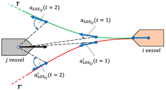 The idea is depicted in Figure 4, where a head-on encounter between vessels i and j occurs; here, the LOS angles for trajectory monotonically increase, and therefore, it is deemed as compliant. In contrast, the monotonically decreasing LOS angles of the trajectory confirm its non-compliance as per the COLREGs intentions. A penalty for non-compliance of a vessel i encountering a vessel j in a ‘head-on’ or ‘give-way’ situation can therefore be formulated,