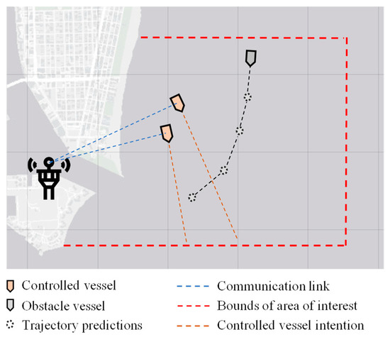 Having presented the proposed MPC controller, this section describes its integration within a general control framework. As shown in Figure 5, the framework is comprised by an offline and an online process. The offline process corresponds to the RBF trajectory prediction model training, using data from a specific area of interest (for example, a port)—naturally then, it could be undertaken by the port authority. The online process corresponds to the real-time control of autonomous vessels in the presence of obstacle vessels in the area of interest. The MPC collision avoidance controller, as described in Section 3.2, is integrated here and is supplied with real time trajectory predictions of all obstacle vessels in order to calculate the optimal control actions for the controlled vessels. Since the RBF trajectory prediction model has been trained offline in the port authority premises, it is sensible to place the MPC controller there too, and to communicate the computed control actions per control timestep via a communications link with the controlled vessels. Figure 6 demonstrates this concept.