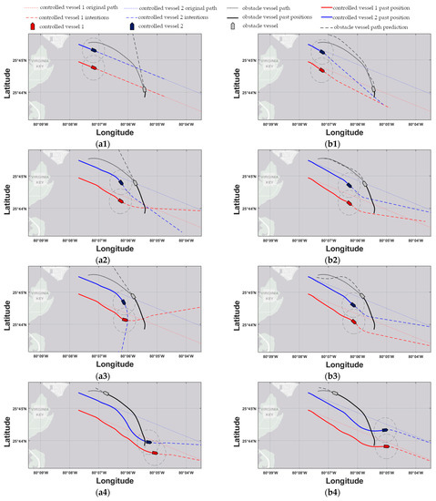 Next, the performance of the two controllers is assessed in an overtaking/crossing encounter in scenario 2. Here, the effect of the used trajectory prediction models is once again eminent: At timestep 6 (see Figure 8(a1,b1)), MPC-RBFP calculates a sharp control move to port-side for controlled vessel 1 in anticipation of the obstacle ship’s crossing towards the port of Miami; in contrast, MPC-SLP applies a lower rate of steering for controlled vessel 1, because the straight-line trajectory prediction places its CPA with the obstacle ship at a later time instance. This failure to correctly place the CPAs has adverse effects on vessel 2 trajectory too, since it is displaced unnecessarily to the left in false anticipation of a collision risk. In addition, the obstacle ship crosses into the domain of controlled vessel 1 (see Figure 8(a2)) once it changes course towards the Miami port at timestep 8′. On the other hand, the MPC-RBFP scheme places controlled vessel 1 in a better position to narrowly evade the breach of its safe domain (see Figure 8(b2)) throughout the simulation. This performance is owed to the trajectory that the RBF model generated for the obstacle vessel, placing its predicted CPA much closer to the real CPA for both controlled vessels. Moreover, it should be noted that for scenario 2, unnecessary deviations from the original course are avoided for controlled vessel 2, as indicated by the total deviation values in Table 4. In general, the proposed method achieves a lower overall cost for the generated trajectories, as shown in Table 4, while obtaining a certain degree of cooperation between the two vessels, where one makes way for the other in anticipation of their upcoming evasive maneuvers. Moreover, the results show that the proposed method exhibits robust characteristics against environmental effects, which are modeled as input noise in the vessel dynamic model for the scope of the simulations, while accounting for COLREGs. Lastly, the average CPU time evaluation of the MPC calculation was recorded as 7s for both scenarios, which is well within the allocated simulation controller timestep of 60 s, proving, in fact, that the proposed method is scalable to a greater number of controlled and obstacle vessels.
