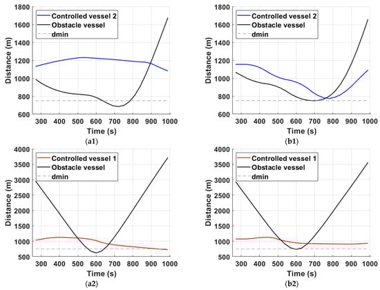 Distance plots for scenarios 1 & 2. The left subfigure column refers to the MPC-SLP scheme, while the second to the MPC-RBFP scheme. Note that for scenario 1 (a1,b1) and for scenario 2 (a2,b2), the MPC-SLP violates the lower limit on distance from CPA; therefore, its trajectories are deemed unsafe.