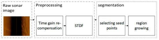 As illustrated in Figure 1, in this paper, the side-scan sonar images are processed in four steps. Firstly, the time gain of sonars is re-compensated in order to make the echo level independent of range. The step can alleviate the problem of varying illumination in sonar images and make the seabed intensity distribution in different regions consistent. It contributes to improving the robustness of adaptively seeds selection and region growing during subsequent segmentation. Sonar images suffer from low SNR and speckle noise, which adds difficulties to fine segmentation. Therefore, a filter referring as STDF is used to enhance sonar images and remove the speckle noise. Secondly, the ratio of the standard deviation to the mean (RDM) is a constant under the assumption that the sonar images obey the Rayleigh distribution. Exploiting the feature that the highlight regions have higher RDM than the seabed reverberation regions, STDF improves the SNR while removing speckle noise. To speed up the segmentation process for high-resolution sonar images, an algorithm based on regional consistency is proposed instead of the global iteration. To avoid losing the highlight and the shadow regions and to reduce the probability of the seabed regions being misclassified into the foreground, seed points are selected based on the statistical distribution characteristics and likelihood ratio test. The seed points are selected in the highlight and the shadow areas adaptively and efficiently to obtain the preliminary segmentation. Then, the subsequent growing is based on the preliminary segmentation and is conducted on the proposed similarity criterion. The seed selection enables the growth process to save lots of time without processing the seafloor reverberation region with large areas. The segmentation obtains fine details and high accuracy by the growth step.