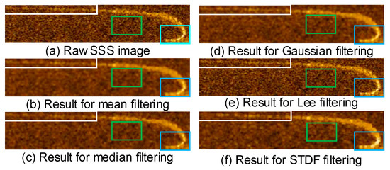 Results of the different filters. The subgraph (a) shows a raw SSS image without filtering, and subgraph (b–f), respectively, show the results for mean filtering, median filtering, Gaussian filtering, Lee filtering, and the STDF proposed in this paper.