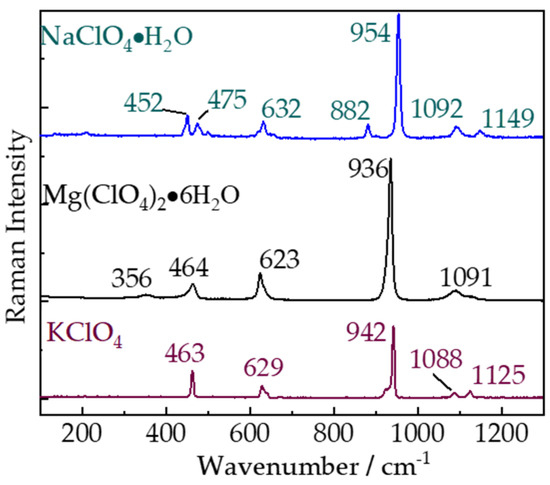 Assignments of Raman peaks of KClO4, NaClO4 H2O, and Mg(ClO4)2 6H2O (in cm−1) [31].