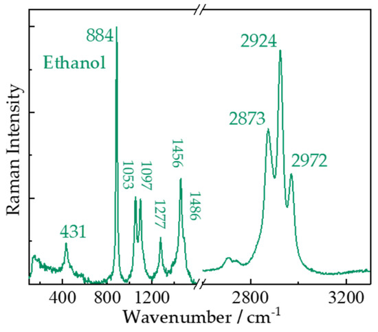 Organics, which might be indicative for life, are always attractive targets in planetary explorations. Definite detection of organics on extraterrestrial planets and moons might suggest the presence of life. We conducted remote Raman measurements on liquid ethanol (C2H6O), solid L-alanine (C3H7NO2), L-phenylalanine (C9H11NO2), and L-glutamine (C5H10N2O3), shown in Figure 6 and Figure 7. The weak peak at 431 cm−1 in Figure 6 is caused by bending vibration of CCO. The strongest peak at 884 cm−1 is attributed to stretching vibrational mode of CCO and peaks at 1053 and 1097 cm−1 are assigned to deformation mode of CCO. Peak around 1456 cm−1 is produced by bending vibrational modes of CH3 and CH2. The shoulder at 1486 cm−1 is bending vibrational mode of CH3.The symmetric stretching mode of CH3 is observed at 2873 cm−1. The symmetric and asymmetric CH3 stretching modes produce peaks at 2924 and 2972 cm−1, respectively [45]. We did not observe water peaks because of the 99% volume ratio of the ethanol.