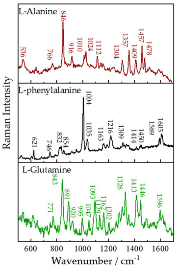 L-alanine (C3H7NO2), L-phenylalanine (C9H11NO2), and L-glutamine (C5H10N2O3) serving as basic elements for the various proteins would display many Raman peaks due to many different kinds of vibrational modes. The Raman spectra of them are shown in Figure 7. For L-alanine, the strongest Raman peak 846 cm−1 is attributed to the (CCH3) symmetric stretching vibration, the 532 cm−1 peak is due to the rocking motion of the CO2− group. The rocking motion of the CH3 group appeared at 1010 and 1024 cm−1. A Raman peak of 1112 cm−1 is attributed to CN stretching vibration and 1304 cm−1 is caused by CH deformation. The CH3 symmetric deformation band (1357 cm−1) and asymmetric deformation bands (1457 and 1478 cm−1) were also observed. In Raman spectra of L-Phenylalanine, the intense Raman peaks at 1004 cm−1 of L-Phenylalanine is caused by C-C symmetric stretching in ring. Peak at 621 cm−1 exhibits the presence of O-C=O in-plane bending modes. Wagging vibration of CH2 is observed near 832 cm−1. 854 cm−1 is assigned to NH2 deformation. 1035 cm−1 is distributed to C-H plane deformation in ring. Raman band corresponding to C-N stretching is observed at 1163 cm−1. Raman peaks at 1216, 1309, 1414, and 1450 cm−1 are, respectively, identified to ring breathing, CH2 wagging vibration, symmetric stretching vibration of COO−, and CH2 scissor vibration. C-C stretching in ring displays two Raman peaks around 1589 and 1605 cm−1. From Raman spectra of L-Glutamine, we can find that the ν(CN) vibrational band can be found at 843 cm−1 and the ν(CC) vibrational bands are at 995 and 1047 cm−1. The δ(CH2) rocking vibrations (891 cm−1) and δ(CH2) twist vibrations were also obtained. Raman peaks at 1093 and 1328 cm−1 are attribute to the symmetric ν(CN) stretching vibrational band and the CH deformation vibration. Two δ(NH3+) rocking vibrations were observed at 1129 and 1162 cm−1. The detailed assignments of these three organics are listed in [46]. The ability for distinguishing organics of our remote Raman system has been demonstrated by experiments with L-alanine, L-phenylalanine, and L-glutamine.