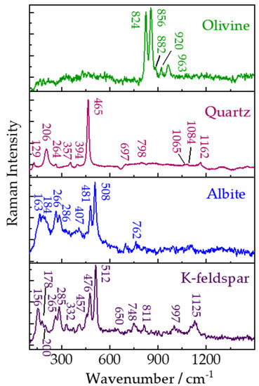 - Freeman, J.J.; Wang, A.; Kuebler, K.E.; Jolliff, B.L.; Haskin, L.A. Characterization of natural feldspars by Raman spectroscopy for future planetary exploration. Can. Mineral. 2008, 46, 1477–1500. [Google Scholar] [CrossRef]