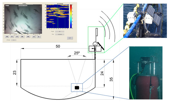 Scheme of the continuous long-term monitoring system, composed of a control echosounder, a video camera, and a real-time transmission system. A floating platform with the video camera and the ultrasonic transducer was placed at a depth of 24 m and cabled to the surface where the autonomous echosounder and communication systems were placed in a waterproof box. The solar power electronics and batteries were placed in a second box together in a structure fixed to the cage rim. The resulting synchronized video and echogram are also depicted.