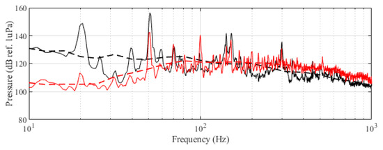 Original recorded turbine emission (black) and reproduced noise used in the experiment (red). Dashed curves correspond to the third-octave levels (dB ref 1 Pa RMS) of the same signals.