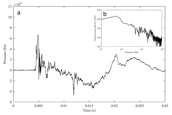 Impulsive noise temporal recording of a lupara used for tuna slaughter (a) and its spectral content (b, inset).