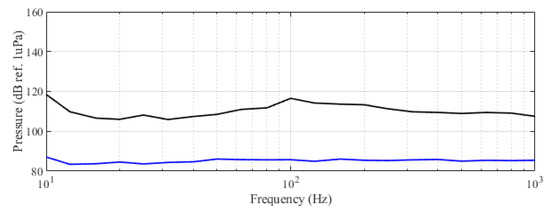 This behavior can be interpreted in relation to feeding boat-produced noise, avoidance movement, and feeding maneuver. However, it is clear that, as expected [33], tuna reacted significantly to noise. Figure 8 shows the recorded spectra of the acoustic landscape of the farm when the feeding boat was moving alongside the cages.