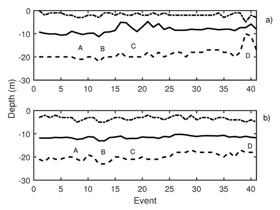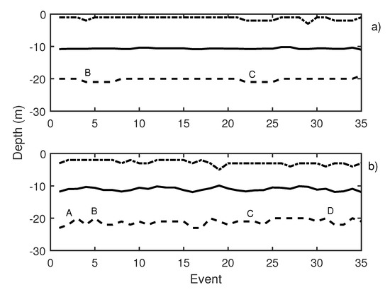 During the second working day, 41 events were emitted. Knudsen echosounder digital gain was balanced, and different pure tones were sequentially emitted. Pure tones of 19 Hz (events 3 to 5 in Figure 11), 50 Hz (events 6 to 8 in Figure 11), and 300 Hz (events 9 to 11 in Figure 11) were reproduced using the underwater sound projector. Those pure tone emissions caused an increase in school activity that could be observed at two echosounders (Figure 11a,b, label A). In Table 2, changes in swimming tilt and length of the traces are described. Changes in the length of the traces were documented to correspond to changes in the swimming velocity of the tuna. In the same way, changes in average swimming tuna tilt were observed, and tuna swam upward and downward. These changes occurred in expansions and contractions of the school. Additional measurements were carried out by performing the acoustic emission but considering other types of noise, in this case, a lupara shot (Figure 11, label B). Specifically, the lupara emission was performed with a peak SPL of 216.4 dB (ref 1 Pa). As a result, the average depth of the tuna school and the upper and lower limits decreased. In addition, swimming tilt changed (Table 2), and, consequently, the school swam farther from the sea surface. After this moment, broadband noises were emitted. During broadband noises (label C in Figure 11) school behavior remained unstable. Contractions and expansions of the school were detected. Finally, a 50 Hz pure tone was emitted with an SPL of 165 dB ref 1 Pa. This emission was repeated from event 38 to event 40, and it is illustrated in Figure 11, label D. These events caused a large contraction of the school, so that the difference between the upper and lower limits decreased from 19 to 13 m. Results obtained on the second day indicated that tuna presented the same alarm behavior as in the previous day.