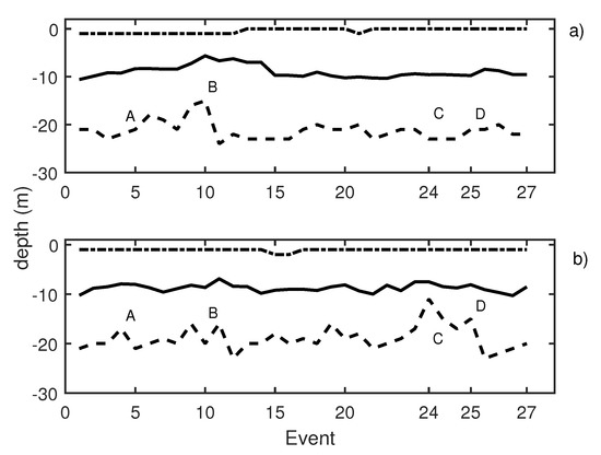 (a) Knudsen echosounder data recorded on day 2; (b) Biosonics echosounder data recorded on day 2. In both cases, the solid line represents the average depth of the school; the dashed line represents the lower limit of the school; and the point-dashed line represents the upper limit of the school.