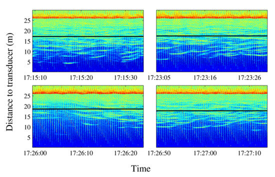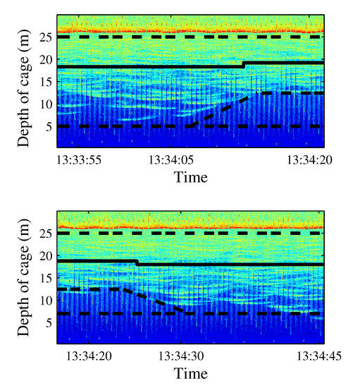 The monitoring of the usual behavior of the tuna in the cage resulted in 700 h of acoustic echograms and 150 h of video recordings. As a result, it could be inferred that the tuna school usually swam in a circular or elliptical pattern [30,31] covering a large area of the cage, swimming closer to the cage nets. As expected [32], the school depth exhibited circadian rhythms. During the middle of the day, the school tended to be closer to the surface, going deeper overnight. This behavior was repeatedly observed during the period of continuous monitoring and recording. An average night/day depth difference of 2.8 m was noticed. It was also found that the school reacted to the feeding boat’s approach. Tuna were fed with frozen mackerel blocks thrown using a tube from the boat to the middle of the cage surface twice per day. As the boat approached, tuna dove downward from the surface and swam deeper even before the boat or its shadow were visible. Then, the school remained far from the surface as the boat arrived, the boat was moored beside the cage, and food was given. Only when the boat departed did the school rise up again. Figure 3 shows the echograms corresponding to the described process, where the depicted distance of the school gravity center from the cage bottom to the transducer is represented.