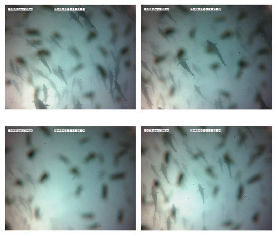 Figure 15. Images recorded during a 10-minute emission. The absence of tuna after a few minutes should be noted (third frame). Tuna shapes are slightly masked by the presence of copepods on the camera lens. - Swimming direction: to identify possible changes in swimming direction, ten random intervals of five minutes of video recordings were analyzed before and after long acoustic emissions. During the intervals before the emission, none of the tuna changed their swimming direction from that of the school. However, after a long noise emission, an average of 15 tuna individuals were registered to swim in the opposite direction at a higher speed. This reaction was observed in addition to the two changes described above.