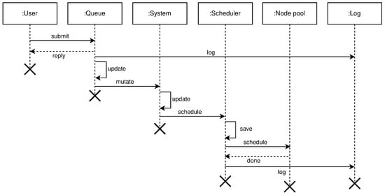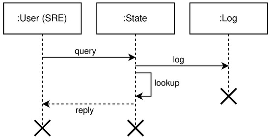 Figure 6. High level query operation diagram. - mutate or creation of new clusters, regions, and topologies from the existing pool of free nodes (resources). Mutate operation requires following entities: User, Queue, System, Scheduler, Node Pool, and Log. The user submits a description file containing an infrastructure set up—a new infrastructure configuration. The queue accepts this new state and replies with an acceptance message to the user. The queue is drained at some configurable time t, to prevent overflow of the system, and it sends the mutate message to the system. The system accepts the mutate message, reserves nodes, and creates a new infrastructure configuration. When data is successfully stored, the system will schedule a new execution task, a new infrastructure to be physically set up. The scheduler executes the task and informs the node pool that needs to be part of the same cluster to start the membership protocol. When the membership protocol is done, the message is sent to both scheduler and the system. The system receives the health-check messages and properties of the cluster. The scheduler receives the done message, to signal that the scheduled task is done. Figure 7 shows the high level communication for mutate operation;