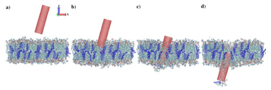Figure 1 shows four instantaneous snapshots for CNT-axis indentation with an angle of 15 degrees. The first snapshot (Figure 1a) shows the initial configuration. Figure 1b,c show the nanotube reaching the upper and lower surfaces of the membrane, as defined by the glycerol backbones of the constituent phospholipids. Following indentation, in most cases, a few lipid molecules were removed or found within the nanotube (Figure 1d).