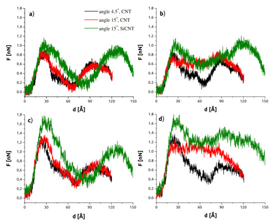Figure 2 compares the average SMD forces for each set of parameters versus the depth, d. Note that d represents the z-axis measured depth of penetration into the membrane and does not equate to the distance of travel (which is greater for the tube-axis cases). Data for 9° tilt were similar to that for 4.5° tilt, and have been omitted for clarity (force data for 9° cases, and work plots and other omitted miscellany, have been included in the supporting information). The main comparison shown is between the two CNT curves in black (4.5°) and red (15°). The top row shows data for the lower rate of m/s, and the corresponding m/s cases are below. The overall force was higher for the higher rate (by about 0.2–0.5 nN), as one may expect. The first peak is associated with the upper (at approx. Å) membrane and the energy necessary to separate the lipid heads. The second peak (near Å) is much less sharp and represents an indenter position already substantially outside the membrane, similarly to Figure 1d. The energetically favorable configuration is for the nanotube to be immersed in the hydrophobic membrane’s interior. This second peak therefore did not arise from a discrete event but at the point these hydrophobic interactions were most rapidly broken. The values of SMD forces are in good agreement with those reported in the case of perpendicular indentation [12,30,39,40,41]. This suggests that in the case of limited deviation from idealized circumstances, the force required to successfully penetrate the membrane is not considerably higher than in the case of perpendicular indentation. The calculated interaction energies are presented in the Supplementary Material (Figure S2). The right half of Figure 2 contains data for z-axis indentation. In addition to the force increasing with angle, both the CNT and SiCNT 15° curves feature a plateau between peaks. This relationship is not prominent for indentation along the nanotube axis (Figure 2, left side), and there is no plateau. The conclusion is that what we refer to as z-axis indentation is more akin to cutting or slicing than the needle-like piercing of the other cases. Concomitant with this is a resistance to motion that must be continuously overcome as the nanotube disrupts additional lipid molecules during its motion. As a result of these increased viscous forces, the total SMD work required to penetrate the membrane is larger for z-axis cases than for their corresponding tube-axis cases (see supporting information).