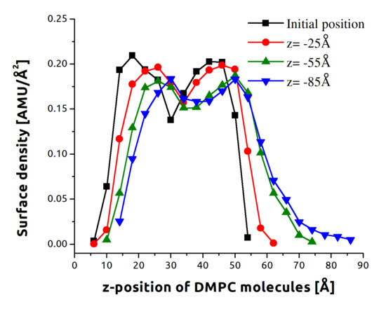 Figure 3 demonstrates the impact to the membrane structure by SiCNT. The initial black curve represents the original density profile of the membrane. The two distinct peaks each represent one of the membrane surfaces. By the time the nanotube has exited, the border between the layers has been washed out and the surfaces are no longer distinct.