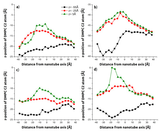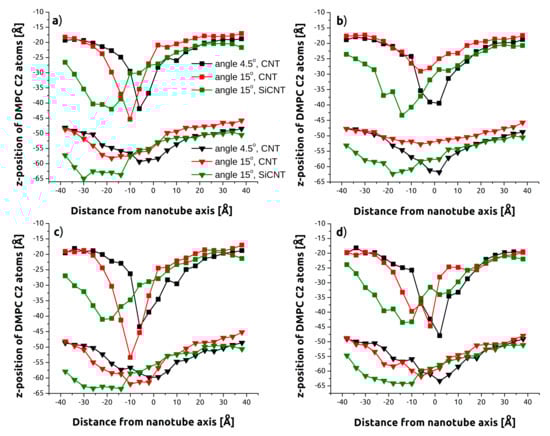 In analogous models, SiCNTs about 20% larger than CNTs. This leads to larger forces overall, as shown in Figure 2. However, the characteristic plateau discussed in the last paragraph is considerably reduced in the z-axis plot. Following the peak at Å, the force does not level off until about Å. This is representative of the increased interaction of the SiCNT with the membrane, which exaggerates both the initial peak and the subsequent compensation just described. The stronger interaction and greater length of SiCNT are also visible in the dramatic rightward shift of the final force peaks throughout Figure 2 and the bending it induces in the membrane, discussed at the end of this section.