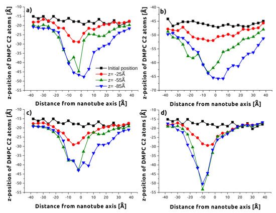 Sequential profiles of average DPMC backbone C2 atom position for CNT systems angled at 15° to a resolution of 4 Å. Z-values correspond to the stages shown in Figure 1. Each plot represents a different case: (a) z-axis indentation at 2 m/s—upper layer, (b) z-axis indentation at 2 m/s—lower layer, (c) z-axis indentation at 0.5 m/s—upper layer, (d) tube-axis indentation at 2 m/s—upper layer.
