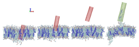 In this study, we continued to investigate the mechanical effects of single-walled CNTs penetrating and withdrawing from lipid membranes by extending simulations to non-idealized circumstances. As molecular dynamics simulations have showed mainly the idealized case when the angle is normal to the membrane’s surface, our goal was to establish how the uncertainty of angle from the ideal (normal) position influences the process of indentation. Understanding the process can help to design CNT-based nanosensors that can consider such uncertainty while designing and functioning. Prior work has assumed the nanotubes to be perfectly aligned both to the bilayer surface and the direction of indentation [19,20]. However, even in the context of atomic force microscopy, it can be challenging to achieve such conditions [21]. Furthermore, while imaging tips can be shortened to limit buckling [22], significant length and minimal diameters are desirable for probing beyond cell membranes and minimizing physical disturbance [23]. Here we characterize the force and membrane disruption over a range of conditions, including angle, speed, and indentation direction.