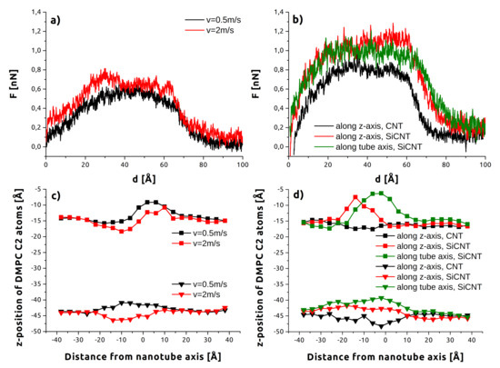 We performed constant velocity steered molecular dynamics simulations [24,25] for indentation of a lipid membrane by carbon (CNT) and silicon carbide (SiCNT) nanotubes, and simulated their subsequent withdrawal. In this scheme, imaginary “steering” particles are attached by virtual springs with spring constant k = 10 to each of the atoms in the rearmost ring of the nanotube. After initial equilibration, the nanotube is then set in motion by giving these particles a specified constant velocity. Analogous (10, 10) armchair nanotube configurations where chosen for the CNT and the SiCNT. The approximate lengths and diameters for this configuration were 50 by 13 Å for the CNT and 72 by 16 Å for the SiCNT; the increased size of SiCNT is due to the greater length of C–Si bonds (1.78 vs. 1.42 Å). Not only may the indentation angle affect the characteristics of the process; the indenter length/aspect ratio has also been discussed in this context [26,27]. It has been predicted that reducing nanotube length may lead to more effective penetration of the membrane [26]. Models of phospholipid bilayers [28,29] and carbon and silicon carbide nanotubes have been described elsewhere [20,30,31]. The membrane consists of 232 1,2-dimyristoyl-snglycero- 3-phosphocholines (DMPC) and 48 cholesterol molecules. In the case of SiCNT, the system was solvated in approximately 39,000 water molecules; for CNT it was approximately 28,000 water molecules. Three indentation angles, 4.5°, 9°, and 15°, were chosen for the CNT, and only the most extreme angle, 15°, for the SiCNTs. All angles were relative to the membrane’s normal axis (Figure 1a). Each angle was simulated for two different modes: indentation directed along the nanotube axis (“tube-axis” indentation) and indentation directed perpendicularly to the membrane surface (“z-axis” indentation)—and for two speeds: m/s (low rate) and m/s (high rate). All simulations were performed at physiological temperature maintained by Langevin thermostat (damping coefficient ) in an aqueous environment with a standard TIP3P water model [32]. NAMD version 2.8 [24] with a standard NAMD integrator (Brünger–Brooks–Karplus algorithm) [33] was used. To ensure sufficient energy conservation, the integration time step was equal to 0.5 fs. Periodic boundary conditions were applied for all systems examined. The size of the box, after equilibration, was approximately equal to 102 × 82 × 137 Å for the systems with a CNT and 100 × 82 × 170 Å for the systems with a SiCNT. The interactions in the membrane were modeled with an all atom–atom CHARMM36 [34,35] force field and visualized with VMD software [36].
