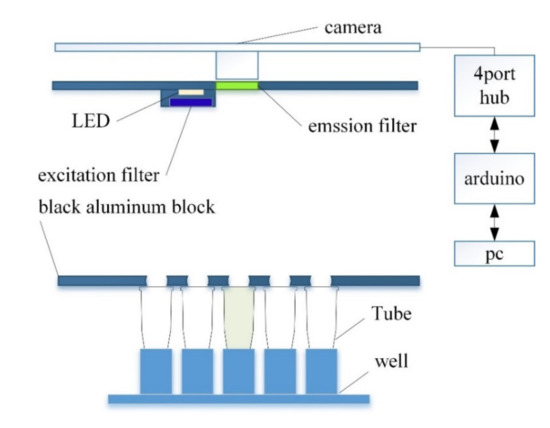 An excitation filter was mounted on the front of the LED, and an emission filter was mounted on the front of the camera to measure the fluorescence reflected by the tube. The LED and camera are connected to the Arduino through a hub so that they are turned on only during shooting to prevent the LED light from changing. The minimum focal length can be fine-tuned by adjusting the height between the tube and the camera, such that the same fluorescence detection was consistently possible.