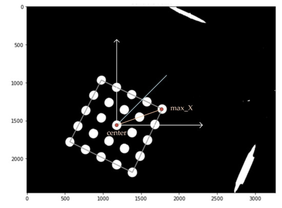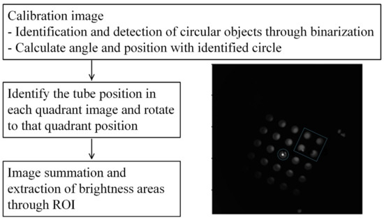 Figure 5 shows an image processing diagram and the center of gravity and bright area in the first quadrant. In order to find the most stable position of the tube photographed in each quadrant, a fluorescent mark sheet for easy image processing was made and attached to the bottom of the aluminum well. For calibration, each quadrant was photographed to identify 25 circles, after which the positions of the circles and rotation angles in each quadrant were extracted. The center and angle of image rotation were calculated at the 5 × 5 tube center and the position of the tube with the largest X-axis value.